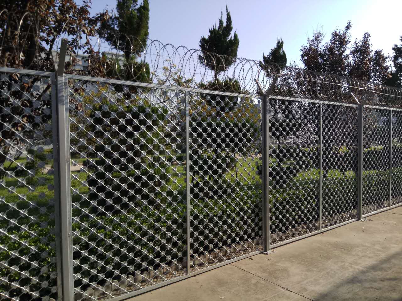 監獄鋼網墻所采用的生產FHB/Q1268焊接標準生產,以低碳鋼絲,鋁鎂合金編織焊接生產, 用于公路,鐵路,飛機場,住宅小區,港口碼頭,花園,飼養,畜牧等的圍欄防護。整體浸塑處理,防盜螺栓連接。